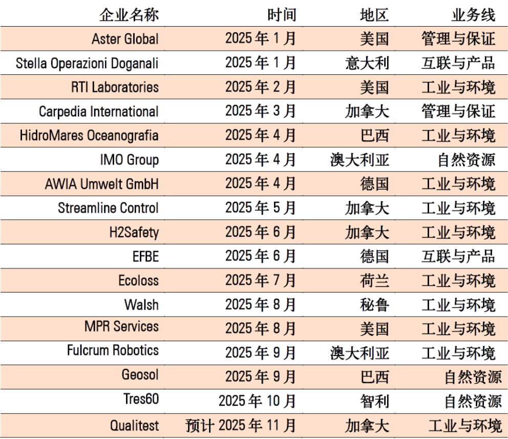 收购布局:2025年至今完成17项补强型收购,覆盖美国、意大利、加拿大、巴西等多地,涉及管理与保证、工业与环境、自然资源等业务线;