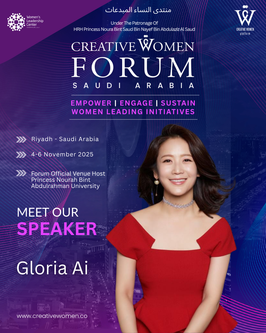 Riyadh, Saudi Arabia – November 2025: Gloria Ai – Bilingual Financial Anchorwoman, Founder of iAsk Media & Capital, China National March 8th Red-Banner Pacesetter (one of China's highest honors recognizing outstanding women), has been invited to deliver a keynote speech at the Creative Women Forum Saudi Arabia 2025 , held under the patronage of HRH Princess Noura bint Saud bin Nayef Al Saud.