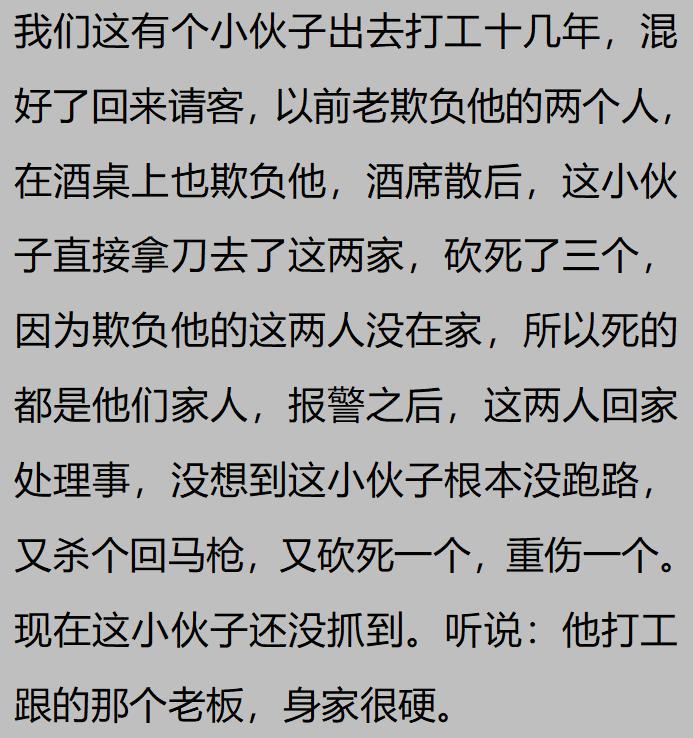 这不就是我爸和我说的吗?我爸年轻的时候,有个小伙来城里饭店干活,那时候学徒一年给结。年底老板一分没给。东北大年三十没钱买火车票回家。小伙拿刀把人家全捅死了。