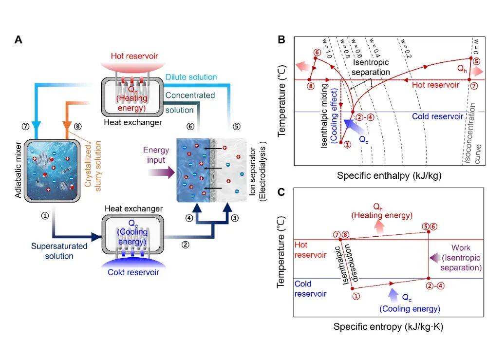如图1a所示,系统包括绝热混合器、冷端换热器、离子分离器和热端换热器四个模块。在冷端,未饱和溶液与过饱和溶液混合,发生吸热溶解反应,温度迅速下降;在热端,经电渗析分离出的高浓度盐溶液则释放热量并重新结晶,实现循环再生。这一循环的热力学特征(图1b, 1c)与传统卡诺循环类似,但不再依赖气体压缩,而是以离子活度和溶解焓变化为驱动力,因此被称为“偶极热卡效应”。