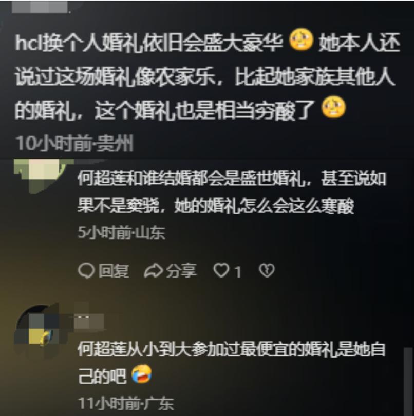 还有人更直接:“何超莲从小到大参加过最便宜的婚礼是她自己的吧”。