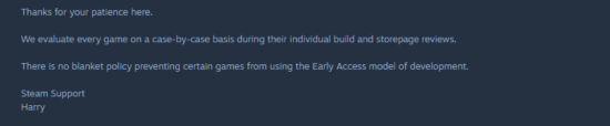 Steam技术支持回复道:“我们会在每个游戏的构建版本和商店页面审核阶段进行个案评估,并不存在禁止特定类型游戏使用抢先体验开发模式的全面政策。”