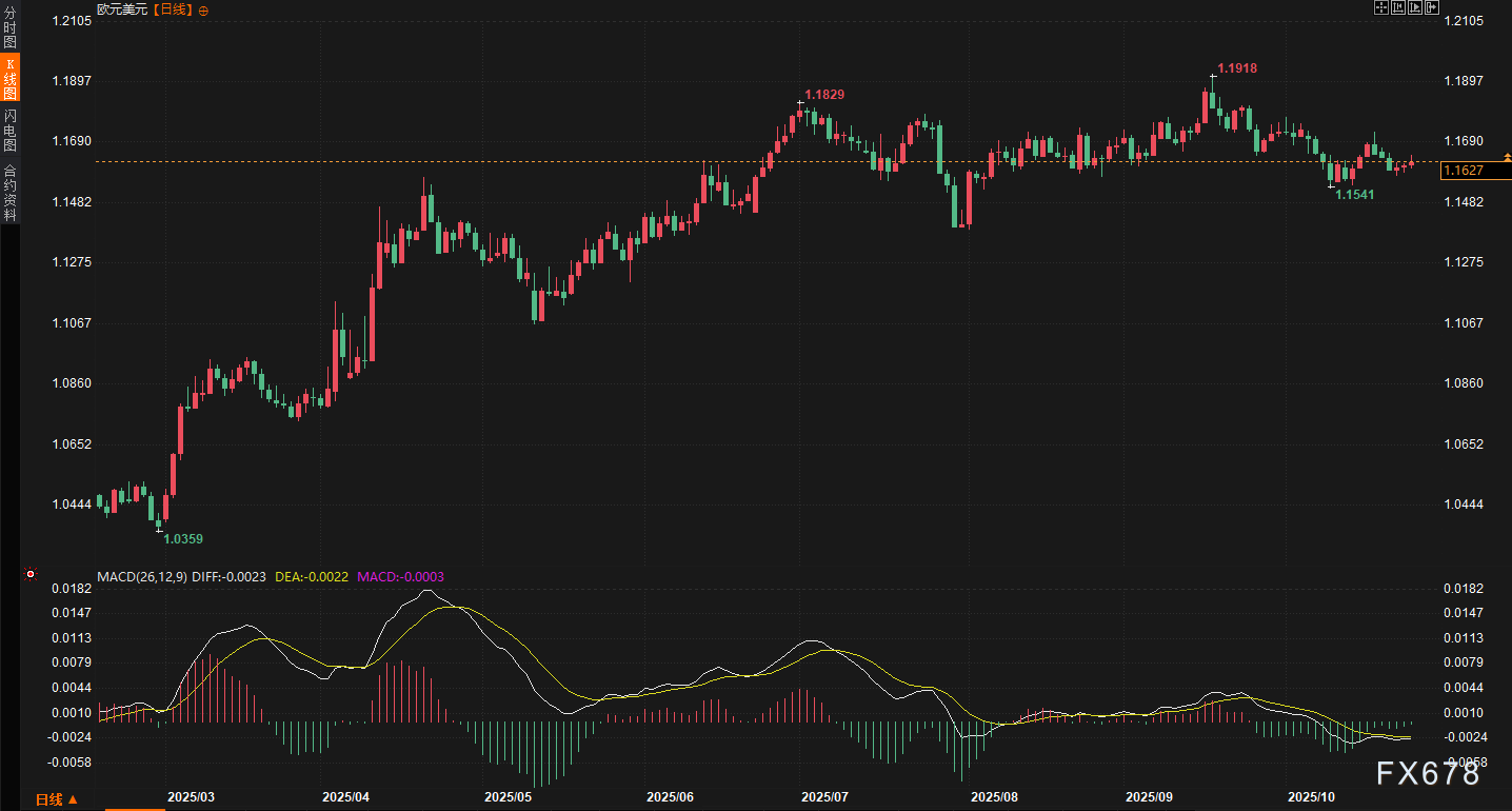 本周美元指数走势稳中趋强,开局延续上周五的上涨动能。周一(10月20日)虽受周末贸易消息余波影响小幅回调,但周二快速反弹,一度触及99关口上方,涨幅约0.3%。此后,周三至周五进入窄幅震荡模式,指数在98.80至99.00区间徘徊,周五尾盘微跌0.021%至98.934点。尽管日内一度下探0.2%,但全周仍录得0.4%的涨幅,显示美元在多头支撑下保持韧性。技术面上,指数站稳50日均线98.50附近,但上方99关口阻力明显,短期多头动能或面临考验。