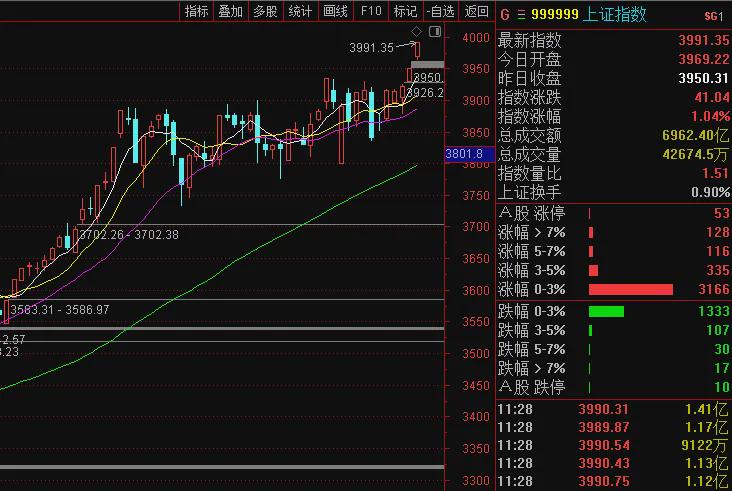 权重股科技股齐发力,大盘放量逼近4000点