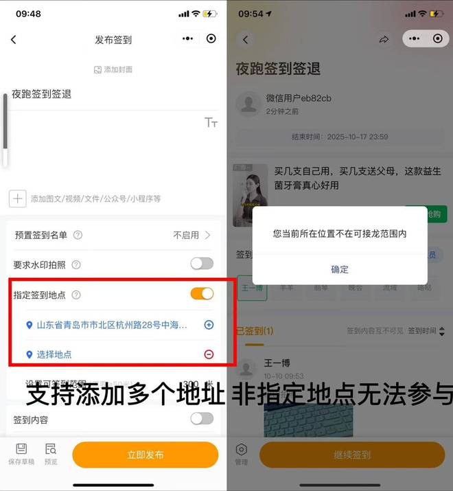 支持 “指定签到地点”,必须到现场才能提交,非指定位置无法参与;
