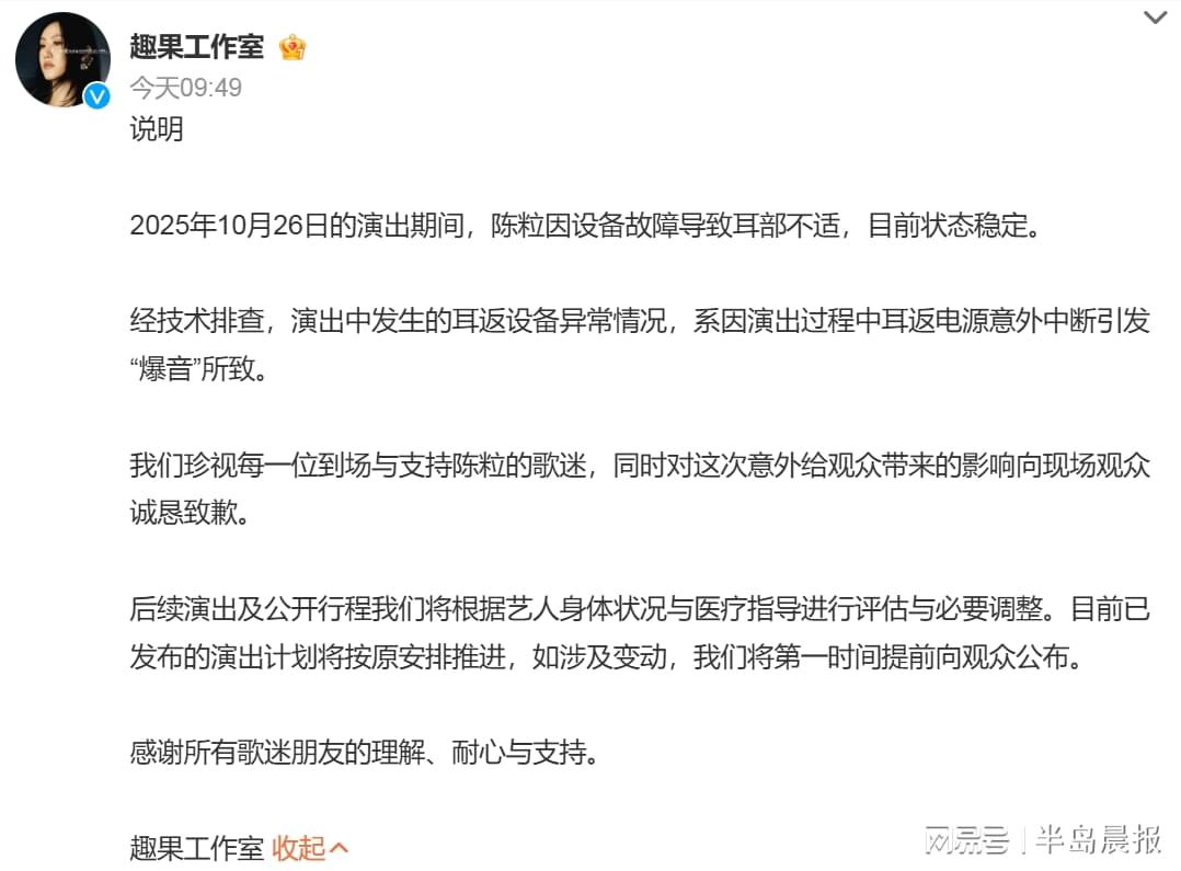 10月27日,陈粒工作室@趣果工作室 发布情况说明:经技术排查,演出中发生的耳返设备异常情况,系因演出过程中耳返电源意外中断引发“爆音”所致。同时,工作室对这次意外给观众带来的影响向现场观众诚恳致歉。