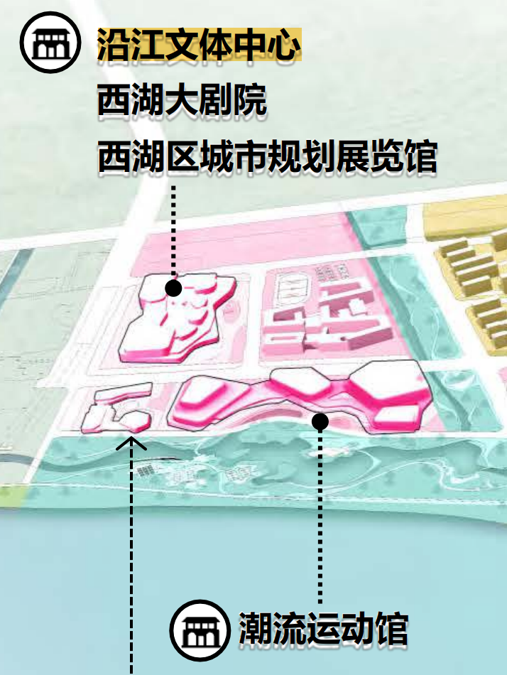 全知道了解到,整个文体中心区域总面积约36.87公顷(注:该数据并未算上道路和外围公园绿地);这个规划蛮大的文体中心区块,囊括了西湖大剧院、西湖区文化展览馆、潮流运动馆等项目;此外,在外围的沿江公园绿地和滨水区域,还规划有水上运动中心。