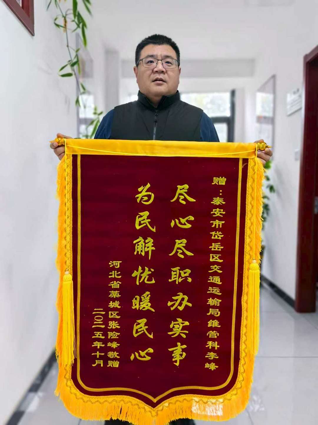 “太感谢你们了!要是没有你们帮忙协调,我这事儿不知道要多费多少周折!”10月24日,河北省石家庄市藁城区的张先生专程将一面绣有“尽心尽职办实事,为民解忧暖民心”的锦旗邮寄到岱岳区交通运输局维管科李峰手中,以此表达对科室积极协调解决其汽修纠纷的感激之情。