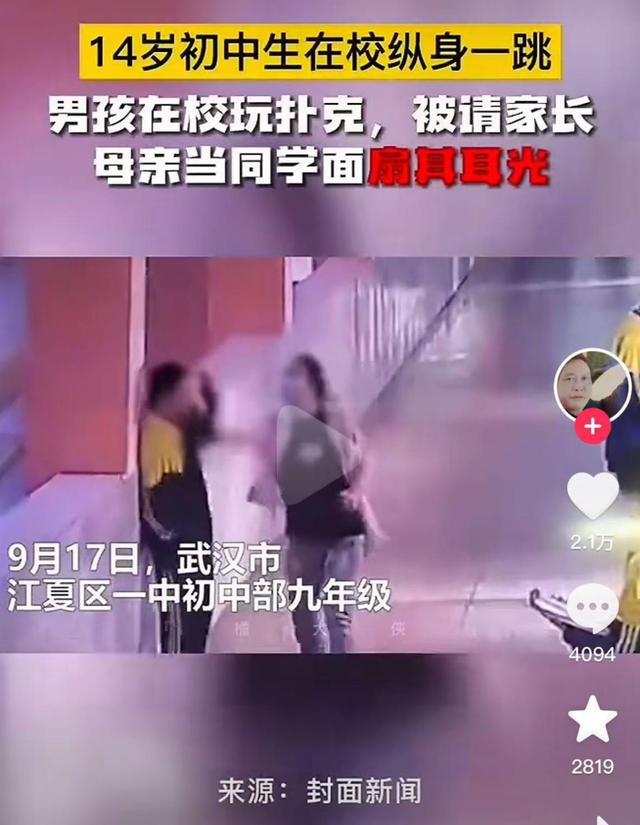 武汉一男孩在学校玩扑克,被妈妈当众掌掴谩骂,转身跳楼身亡。
