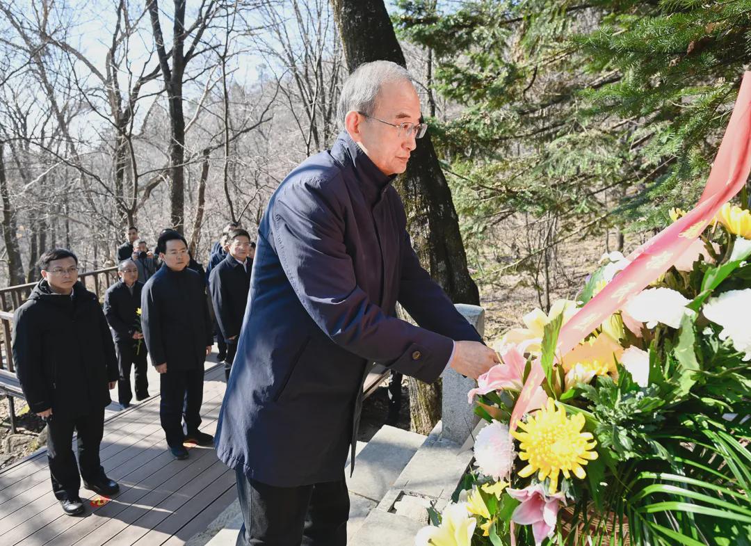 桦甸牡丹岭是东北抗联英雄魏拯民殉国地,古树刚劲挺拔,守护烈士英灵。黄强瞻仰魏拯民烈士殉国地纪念碑并敬献花篮,深切缅怀革命先烈。在魏拯民烈士牺牲的古树下,黄强献上鲜花、鞠躬致敬、祭奠英烈。他动情地说,以杨靖宇、魏拯民等为代表的东北抗联将士在白山黑水间浴血奋战,谱写了气贯长虹的英雄史诗。我们要把这段历史发掘好、研究好、宣传好,大力弘扬东北抗联精神,引导党员干部铸就坚如磐石的理想信念信仰,完成好时代赋予的责任使命,以实干业绩告慰革命先烈。在察看密营战斗生活遗迹时,黄强要求修旧如旧,最大限度恢复原貌。做好魏拯民烈士事迹展览,持续加大宣传力度,让桦甸牡丹岭与磐石红石砬子相互呼应,吸引更多干部群众接受红色教育、经受精神洗礼。