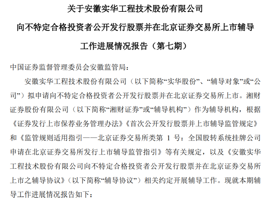 瑞财经 王敏 10月27日,安徽实华工程技术股份有限公司(以下简称“实华股份”)披露关于首次公开发行股票并上市辅导工作进展报告(第七期),拟北交所上市,辅导机构为湘财证券。