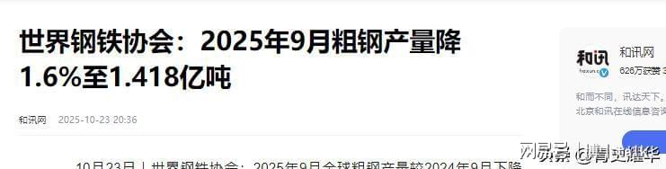 和讯网——世界钢铁协会:2025年9月粗钢产量降1.6%至1.418亿吨