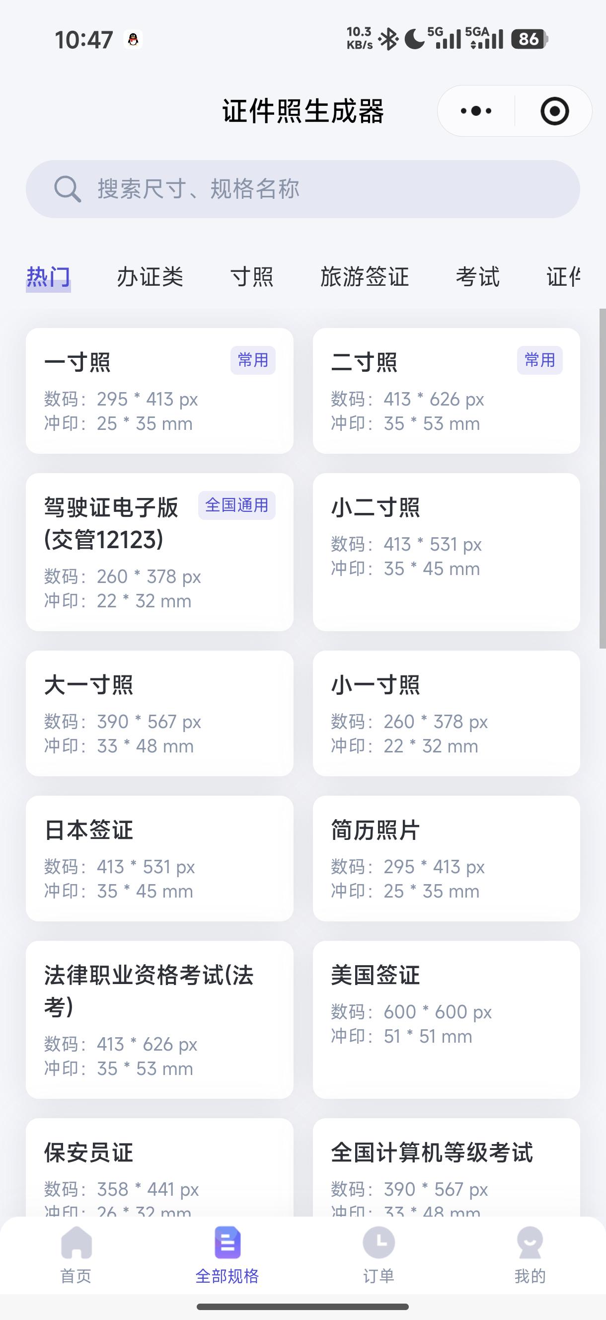 下面是证件照的类型以及尺寸,看看有没有正是你需要的