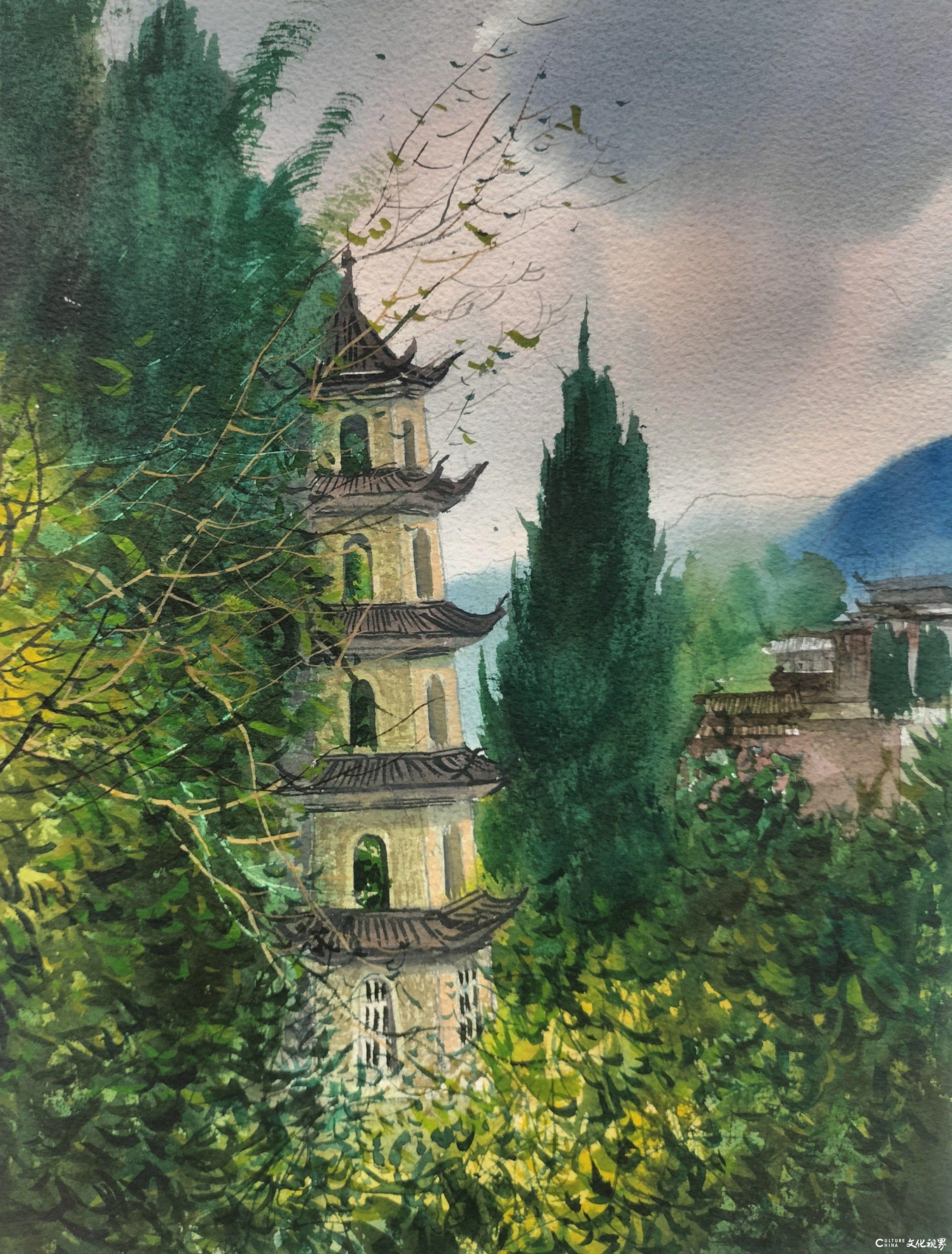 当蒙古族艺术家巴达日胡的水彩笔触及湘西的山水与村寨,一场跨越草原与湘西的视觉对话便在水色晕染中悄然展开。他将对内蒙古草原的精神溯源经验,悉数注入凤凰古城的吊脚楼、德夯的云雾山峦以及湖南的河谷村寨,以水彩为媒介,在湘西风物的肌理里编织出一部诗意的地域史诗。这些作品绝非简单的风光速写,而是以水色为语,在技法与精神的交织中,解码着湘西文化的内核,构建起可感可触的“精神原乡”。