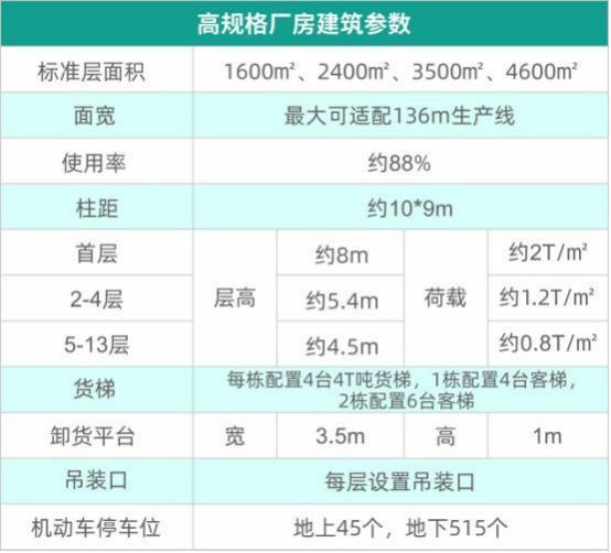 标准层面积2200-4600㎡,首层8m层高,最大可适配136m生产线,10*9m大柱距,4T货梯配置,宽3.5m、高1m卸货平台,货运通路转弯半径12m,大型货车出入无忧。