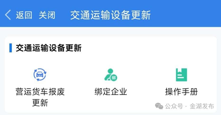实名认证后点击“交通运输设备更新”,先选择绑定企业,再进行申报。