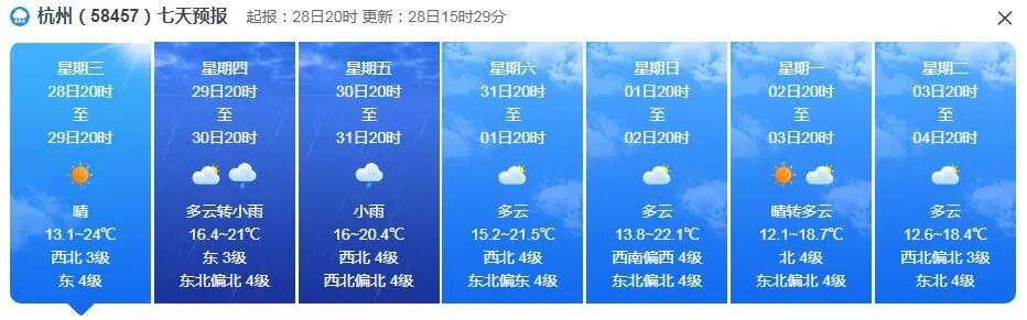 杭州近期的气温相对比较平稳,31日前气温会有小幅的回升,明后两天(29-30日)白天的最高气温23摄氏度左右,加上白天有阳光加持,体感会更暖和一些,但容易被忽略的是——早晚温差依然较大。白天越暖,早晚就越显凉意。