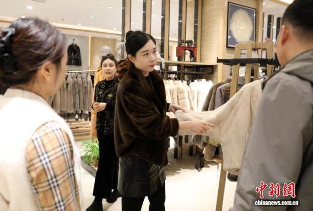 图为博览会上,工作人员为客人介绍裘皮商品。 陈康 摄