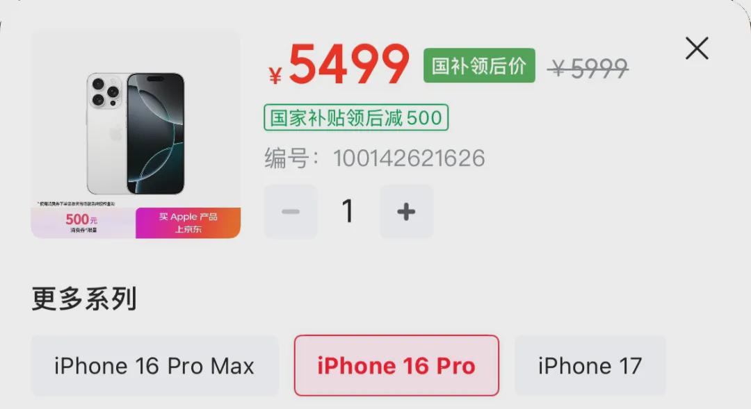 这不,随着双11临近,iPhone16Pro国补再度上线,京东自营8+128GB版又重回5499元起,销量也跟着迅速回升。