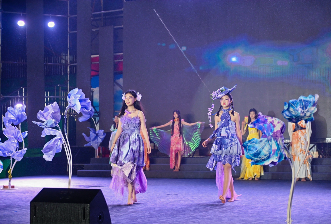 童心织梦,共创未来。非遗服饰走秀《锦绣未来》生动上演,羌族同学们创新运用苗家扎染技艺,将斑斓色彩浸染于服饰之上,展现了北川新一代在文化传承中的创新活力与开放视野;合唱《光亮》用美育传递心中心中不灭的梦想。