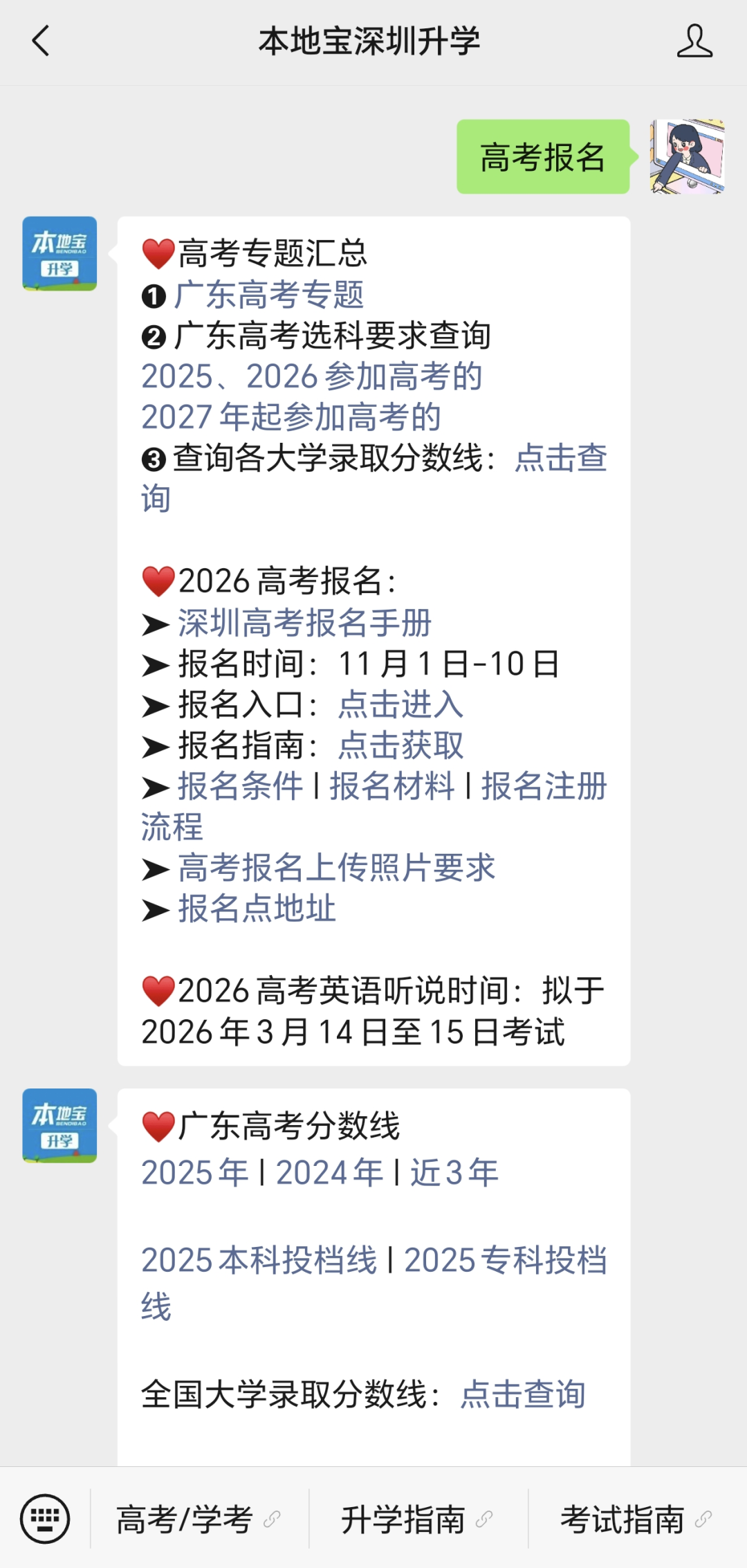 或者长按下方二维码,关注【本地宝深圳升学】回复【高考报名】进入广东高考报名入口,查看报名时间、材料、流程等,获取往年录取分数线