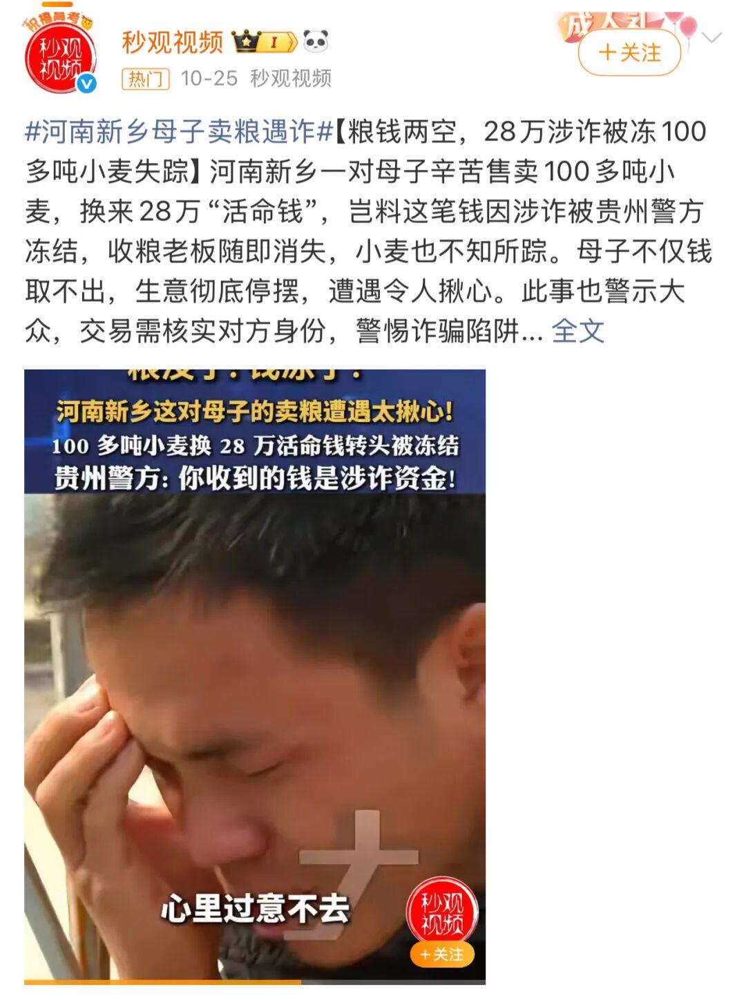有两件风马牛不相及的事情,交织出来的是“不可抗力”之下的个体沉浮。一个是河南新乡母子卖粮食遭遇诈骗,一百吨小麦款28万因为涉诈而被冻结,关键是小麦也失踪了。