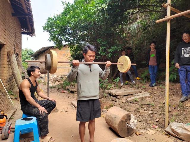 劳永旺用木头制作的杠铃约有40公斤重。