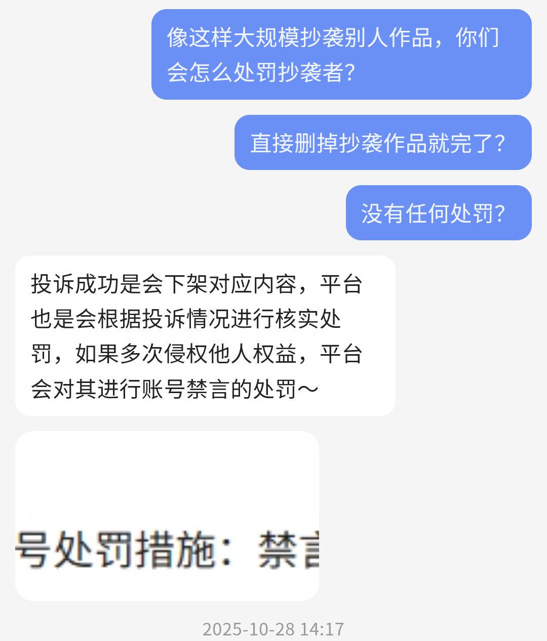 我还问了客服对抄袭者的处罚:目前只有收到举报后才会删侵权作品,除非抄袭者 “多次侵权” 才会封账号。可“多次”具体是多少次?客服没有给出明确数字。