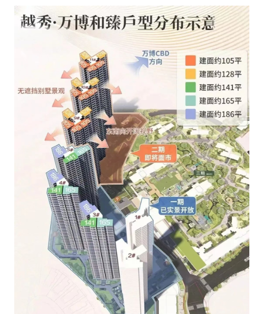 最后,我们来看看越秀·万博城|和臻目前在售的户型。一期推出的建面约122-186平米的南向阔景四房,每个户型均实现了超大面宽设计,并配备了巨幕阳台,确保了充足的采光和通风效果。二期即将推出的户型则更加注重居住品质的提升,主推建面约105平米及128平米的四房两厅两卫户型,同样强调南向面宽和南北对流的优势,旨在为业主打造一个温馨舒适的家。这些精心设计的户型充分考虑到了现代家庭的生活需求,提供了灵活多变的空间布局,适应不同的生活方式。