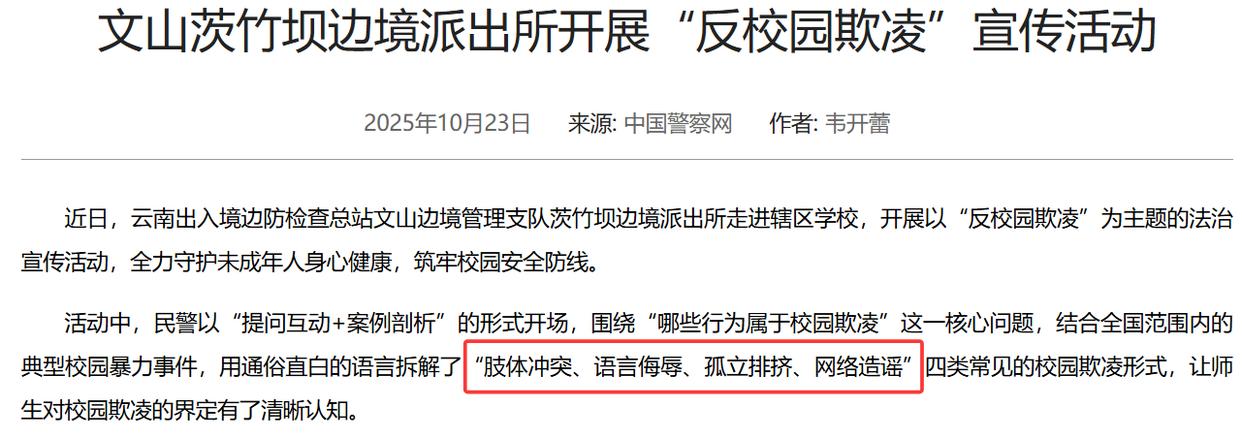 云南出入境边防检查总站文山边境管理支队茨竹坝边境派出所近日开展的“反校园欺凌”宣传活动,明确将“肢体冲突”列为校园欺凌的形式之一。