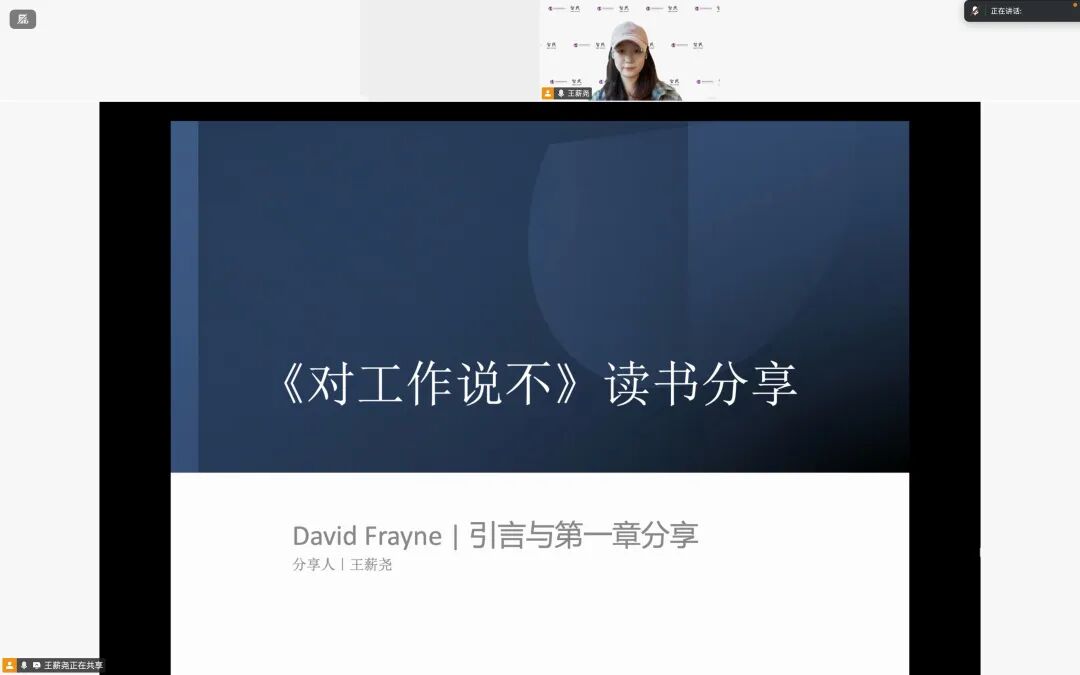 紧接着,来自北京科技大学的谢靓同学和来自南开大学的袁语浩同学带我们深入了前三章,探讨了工作的殖民力量以及部分现代工作是如何消耗我们的时间、索取我们的情感、影响我们的情绪,从而陷入“工作-消费”这一循环牢笼的。