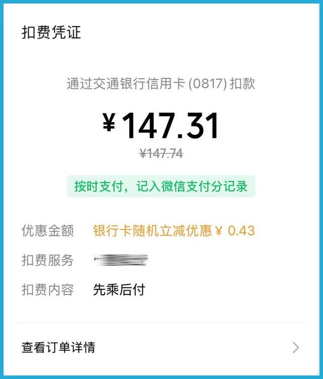 大约1个小时后,张女士看到微信发来的扣款信息,发现竟被扣10倍车费(银行卡随机立减优惠0.43元,实扣147.31元),大吃一惊。