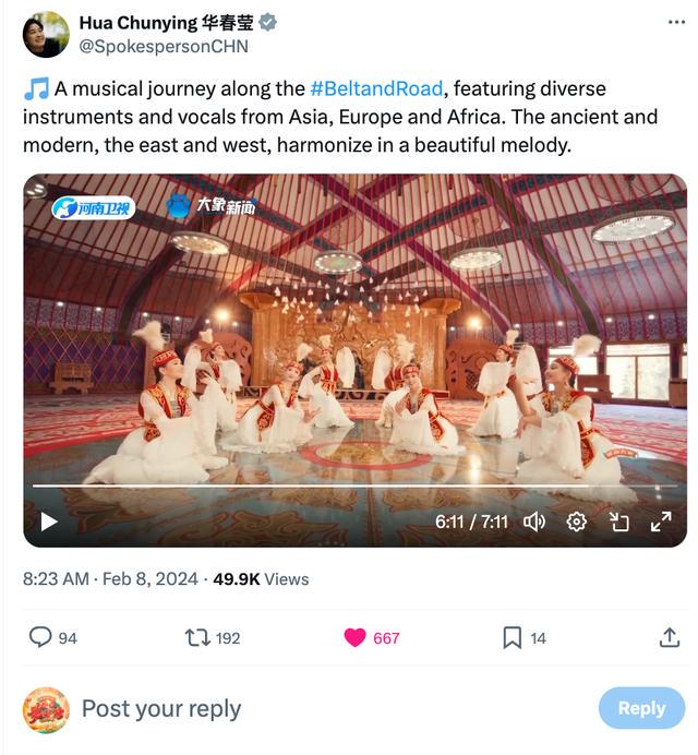 2024年2月8日,时任外交部部长助理华春莹在X平台向全球网友推介《2024河南春晚》节目《一路繁花》。