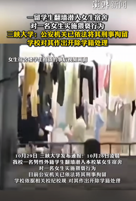 10月29日下午,三峡大学发布通报:“10月26日凌晨,我校一名男性外籍学生翻墙潜入本校某女生宿舍,对一名女生实施猥亵行为。目前,公安机关已依法将其刑事拘留,学校依据相关校纪校规,对其作出开除学籍处理。”