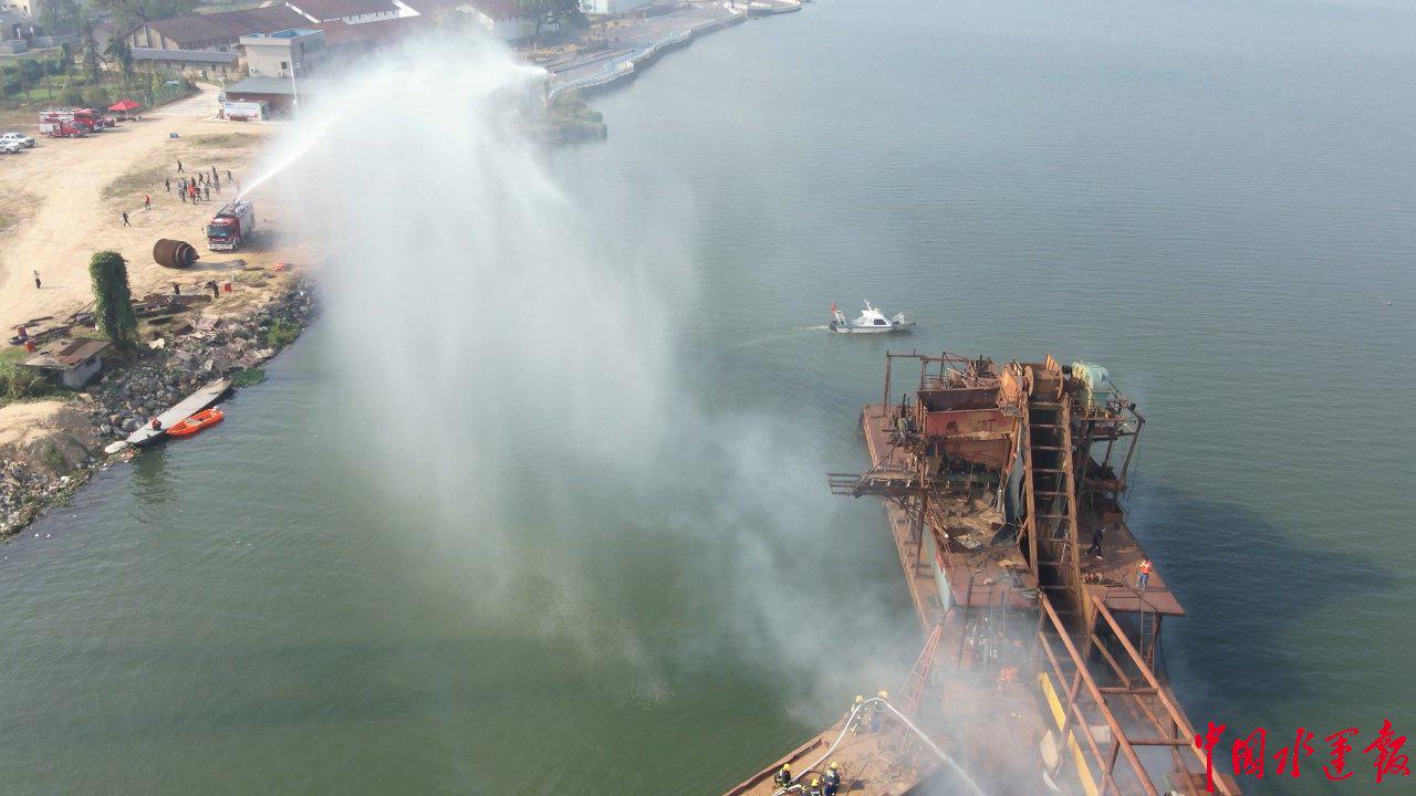 本次演练模拟一艘采砂船在作业时突发火情,并有人员受困的紧急场景。险情发生后,船方立即启动自救并报警。海事、消防、城投及企业应急力量接警后迅速响应,救援船艇、消防车辆快速抵达现场。