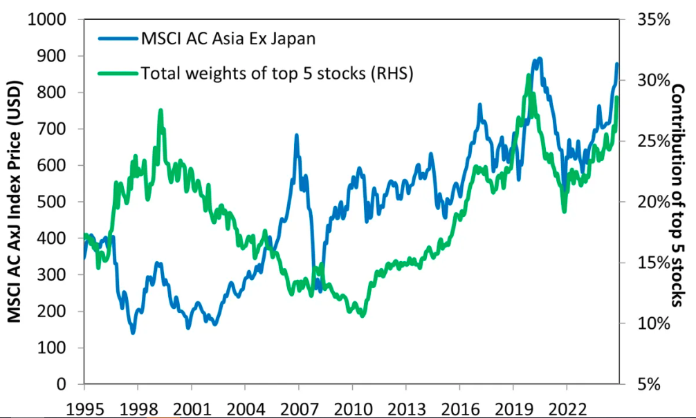 而类似的高集中度风险,眼下在部分亚洲市场同样突出:仅台积电一家公司就占据了中国台湾加权指数近45%的权重,是十年前的三倍。韩国KOSPI指数则已形成双寡头格局,存储芯片巨头三星电子和SK海力士合计占比高达30%。