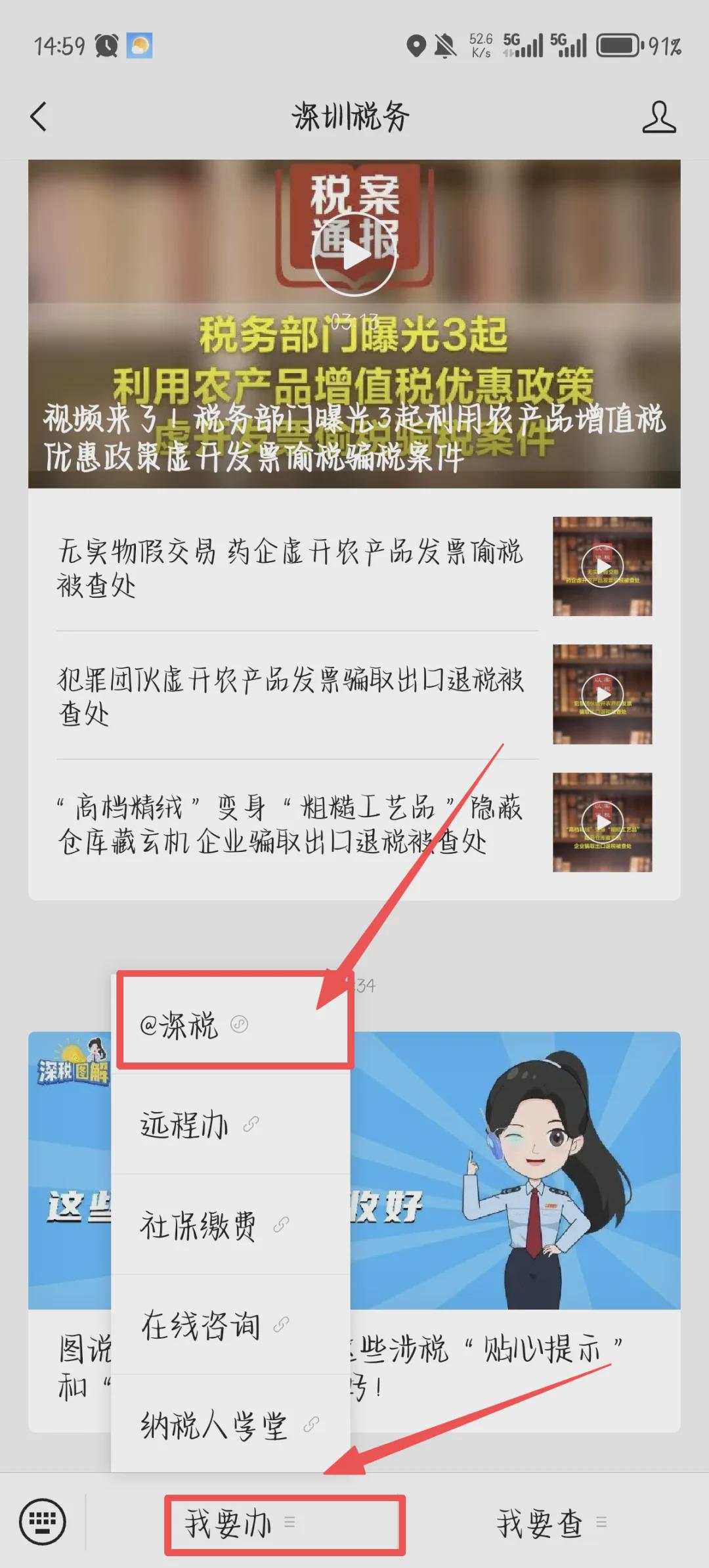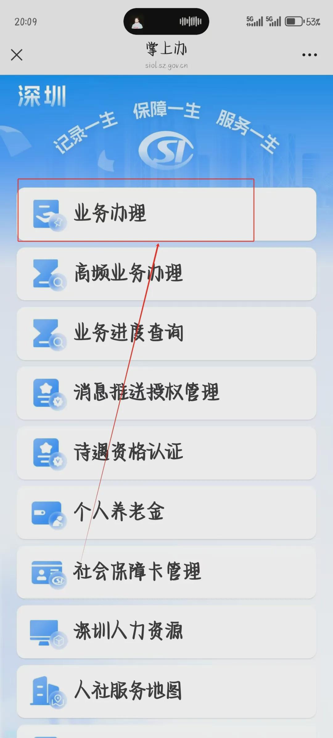 第一步:搜索“深圳社保”公众号,点击“掌上办”