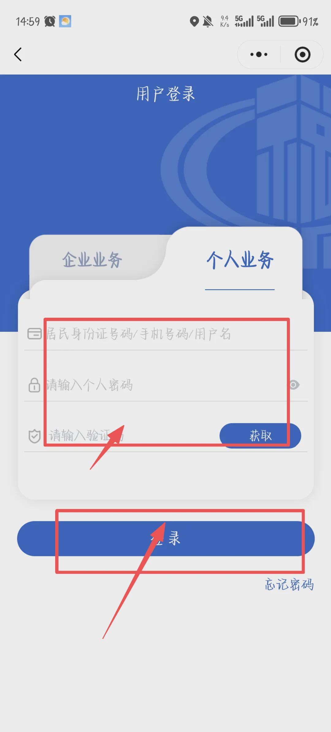 第二步:进入点击“登录”,点击“个人业务”完成登录(温馨提示:如果你显示你未注册,可以下载一个电子税务局进行注册账户,这样你才可以收到验证码)
