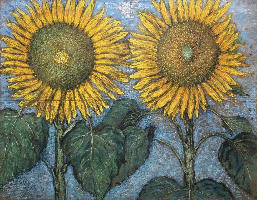 《葵花朵朵向太阳》表现了两株向日葵,镜像式对称盛放。不同于艺术家其他花卉作品,本作采用了近景、满幅式的大胆构图,强化了花卉的视觉张力和压迫感。如此表现,一方面源于向日葵热烈、硕大的特性,另一方面也有时代因素的影响。