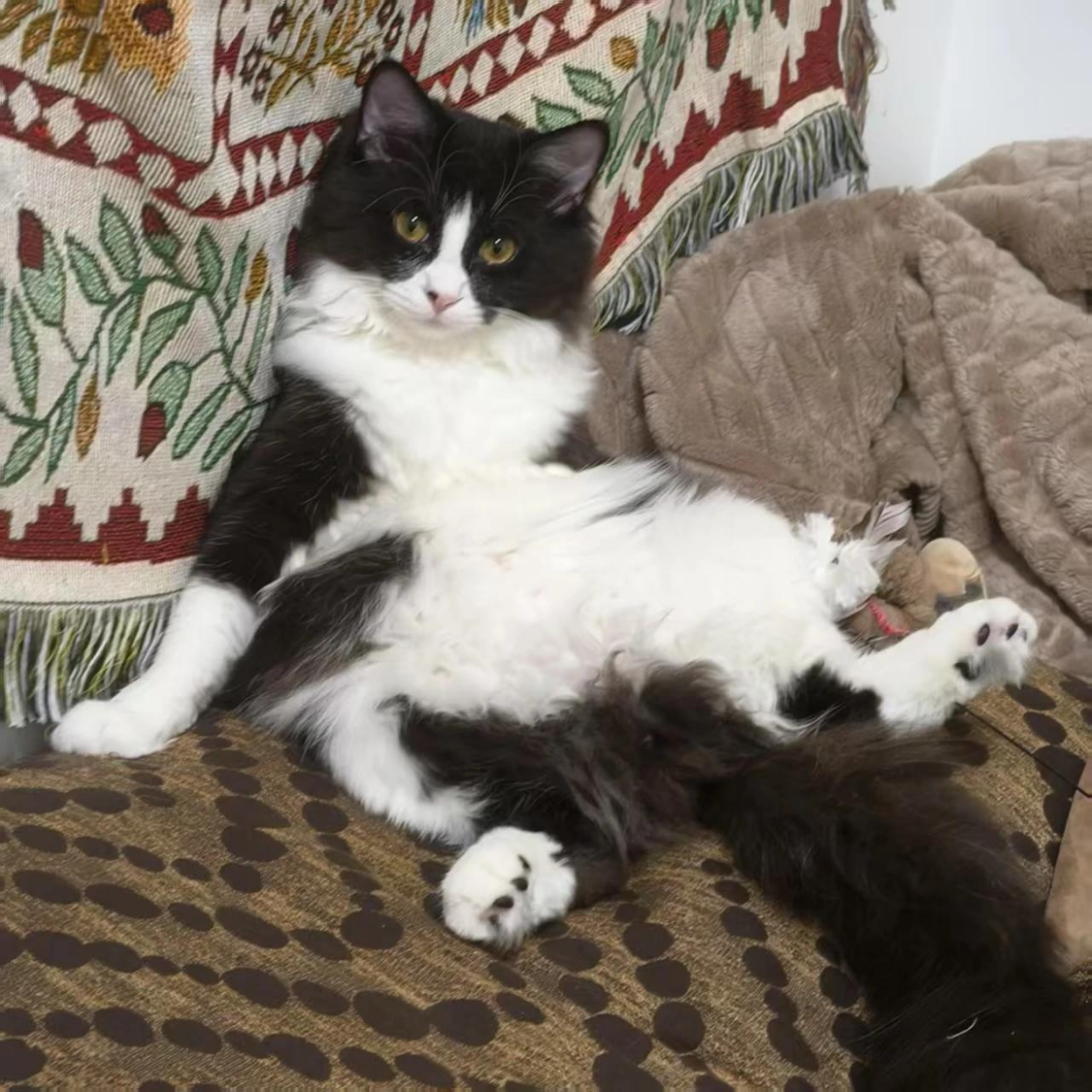 可转头一看奶牛猫——它后腿大剌剌伸着,前爪撑着地,活像蹲在村口晒太阳的老大爷。