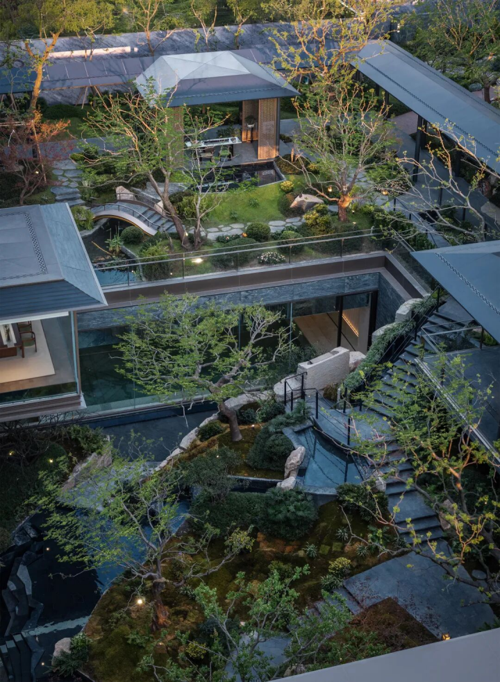 中央景观的设计灵感源自豫园。通过“亭-桥-溪”元素重构,展现一幅立体的山水画卷。