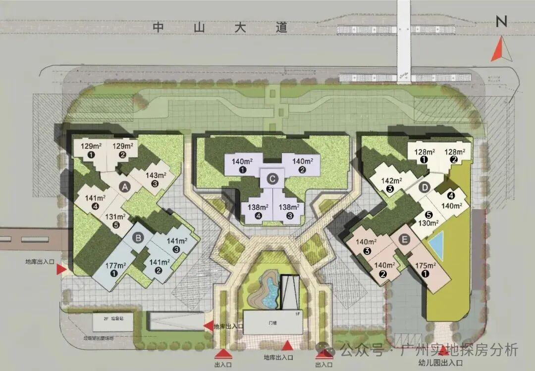 项目楼栋分布和户型:项目总共5栋楼,A栋和B栋、D栋和E栋是两栋并在一起的。由于紧挨着骏景花园,南向视野被遮挡,可能要25-26楼以上才能开阔点,北向的就受中山大道噪音影响,看着城中村。