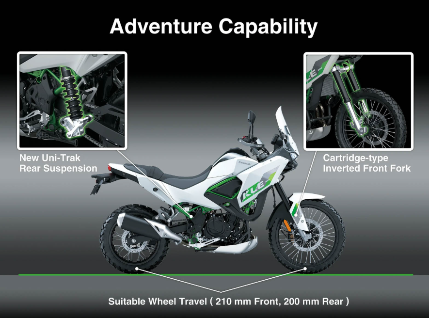 为应对复杂地形,KLE500的悬挂系统迎来全面升级。前轮采用KYB 43mm倒立式前叉,行程达210mm;后轮配备Uni-Trak多连杆中置减震,行程200mm。这一数据甚至接近专业越野车水平。搭配前21英寸、后17英寸的钢丝辐条轮毂,以及IRC品牌越野两用胎,可轻松碾过碎石、泥泞等障碍。刹车系统前轮采用300mm单碟配NISSIN卡钳,后轮为230mm单碟,标配ABS系统且可通过手把开关关闭,满足越野骑行需求。