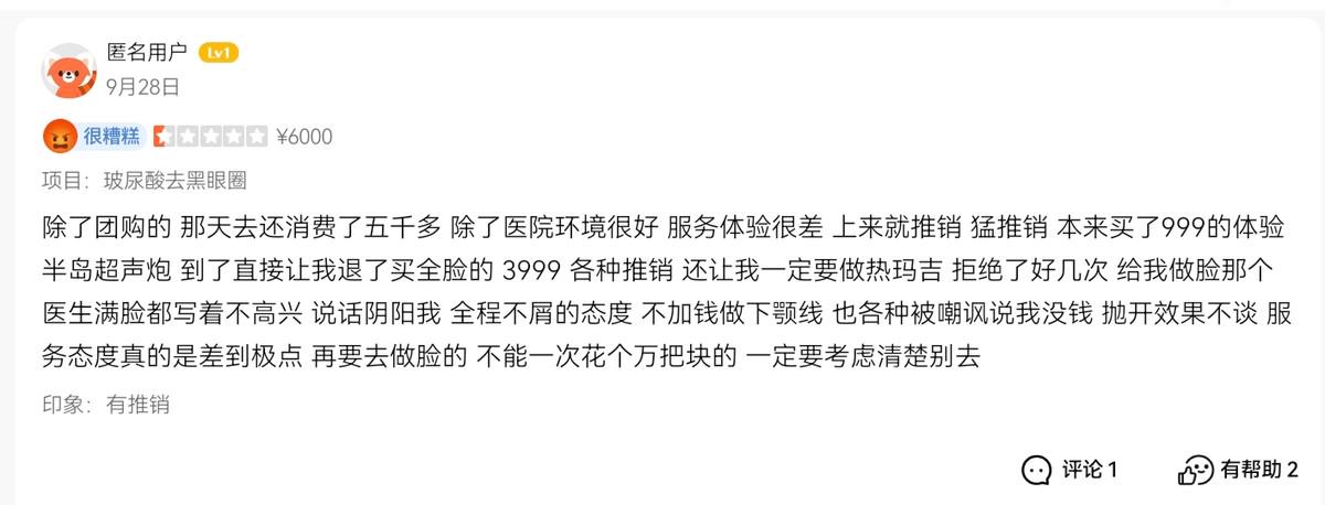 该消费者提到,她原本购买了999元的半岛超声炮体验项目,到店后工作人员直接让其退掉该体验项目并购买全脸的半岛超声炮,价格为3999元。期间,工作人员还要求该消费者一定要做热玛吉,该消费者多次拒绝,而为该消费者做脸的医生却满脸不高兴,说话阴阳怪气,全程呈现不屑的态度。该消费者表示,若不加钱做下颚线,也会被嘲讽说没钱。抛开效果不论,该消费者认为服务态度差到极点。该消费者称,若再要做脸,不能一次花费万把块的人一定要考虑清楚后再决定是否前往。