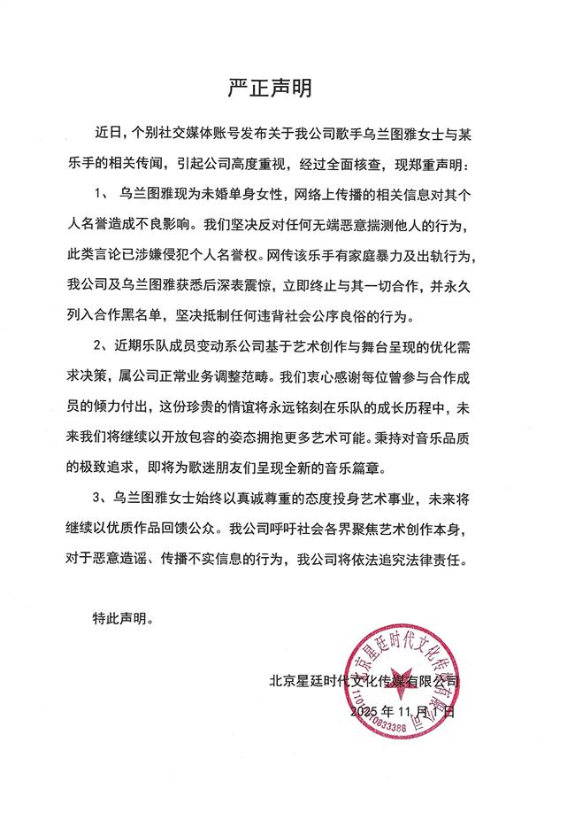11月1日,北京星廷时代文化传媒有限公司发布严正声明,不仅澄清歌手乌兰图雅未婚单身的事实,更针对部分自媒体就乐队成员变动一事无端揣测、乱带节奏的行为作出回应,明确歌手与乐队及乐手的合作自主权不容干涉,同时披露其常年以事业为核心的工作状态,呼吁社会各界聚焦艺术创作本身,并对恶意造谣、传播不实信息的行为,保留法律追责权利。