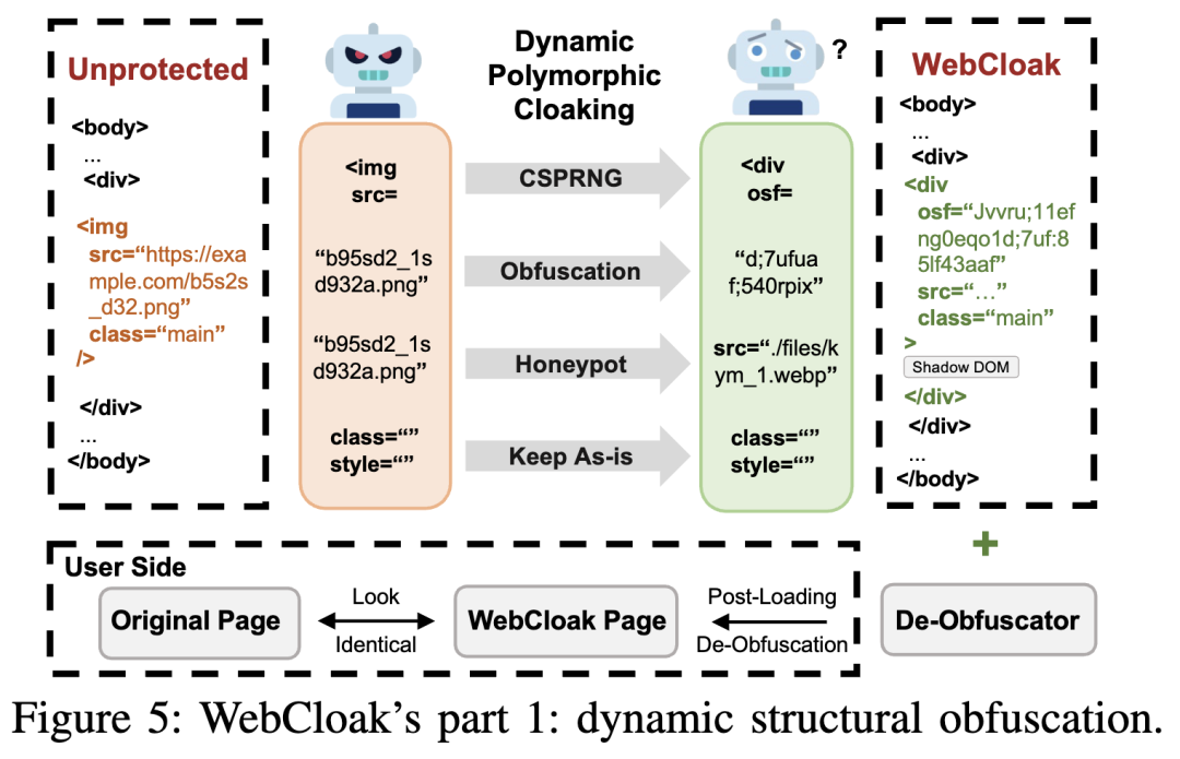 首先,针对解析阶段,WebCloak通过「随机化结构 + 客户端还原」打破Web Agent解析依赖,让Agent无法识别目标元素: