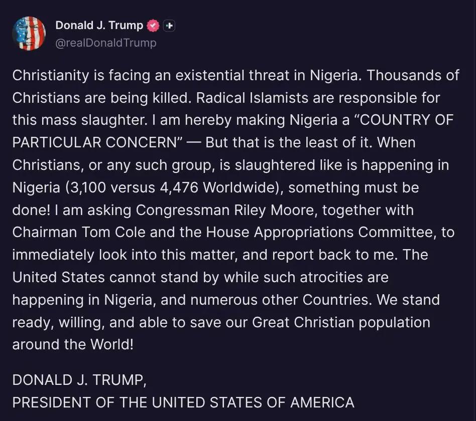 若尼日利亚继续纵容杀害基督徒的行为,美国将立即停止一切援助,并极有可能以雷霆之势进驻这个如今声名狼藉的国家,彻底铲除犯下这些骇人暴行的伊斯兰恐怖分子。我已经命令战争部做好行动准备。如果发起进攻,必将迅猛、残酷而彻底——正如恐怖暴徒袭击我们珍视的基督徒那般!警告:尼日利亚当局最好火速行动!