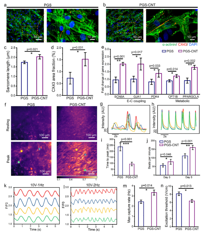 在体外功能验证中,研究团队将新生大鼠心肌细胞(CMs)接种于PGS与PGS-CNT补片上,培养5天后进行免疫荧光染色与钙瞬变记录。图4显示,PGS-CNT组的心肌细胞表现出更成熟的肌节结构、更高的CX43表达以及更同步的钙信号传播。钙瞬变峰值时间显著缩短(94.3 ms vs. 237.2 ms),自发搏动频率更高(160.5 BPM vs. 111.7 BPM)。电刺激实验进一步表明,PGS-CNT补片具有更低的刺激阈值(6.37 V/cm)和更高的最大捕获频率(3.33 Hz),显示出优异的电响应性能。