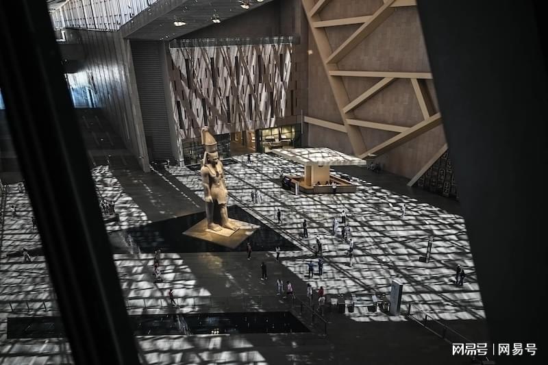 大埃及博物馆的建筑光滑如楔、外形锐利,石灰岩外立面上覆盖着互相嵌套的金字塔形图案,颇有几分机场或购物中心的模样,在棕榈树的掩映下,穿着制服的博物馆工作人员精神十足,高尔夫球车载着游客穿梭其间。