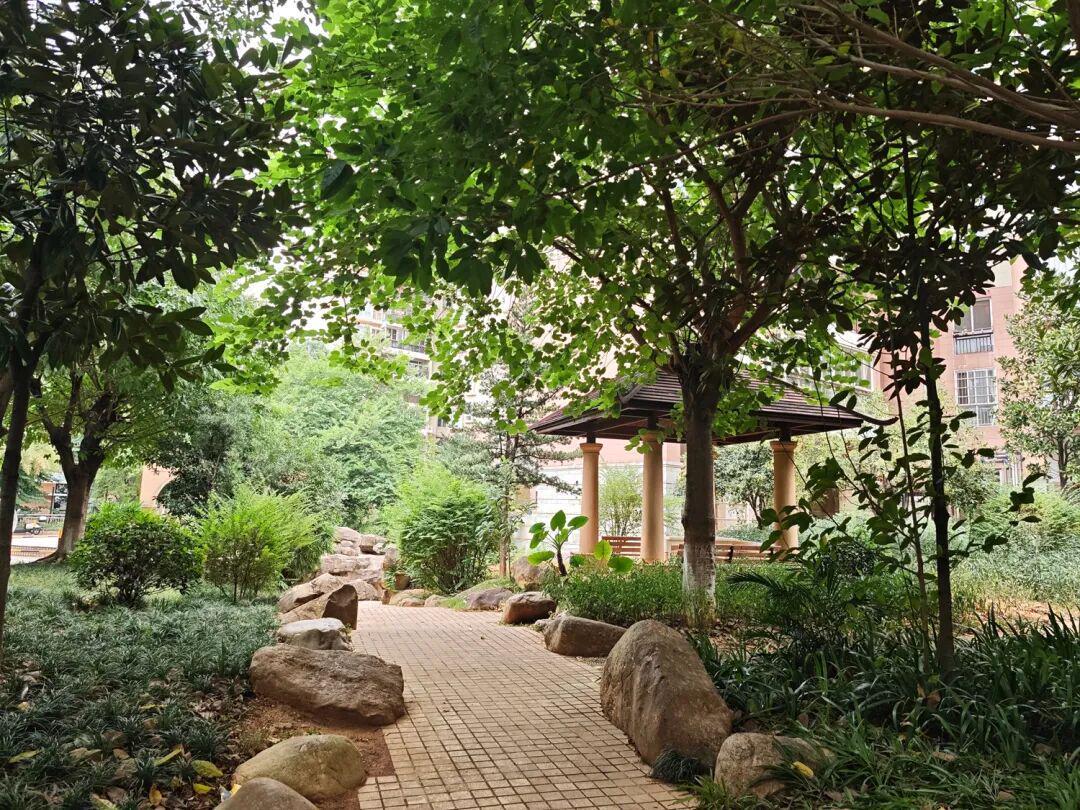 小区内部整体较大,园林略显杂乱无章,树木长势茂盛,各种林间小道,搭配亭子、休闲座椅、岩石等,草坪像是长时间未打理,枯叶较多,维护一般。